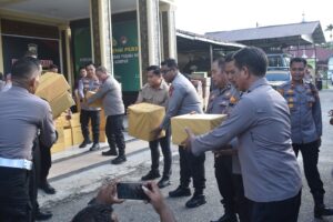 Aksi spontanitas ini dilakukan bersama dengan para Pejabat Utama (PJU) Polres Kampar, yang bahu membahu memuat barang-barang bantuan ke dalam kendaraan yang telah disiapkan.