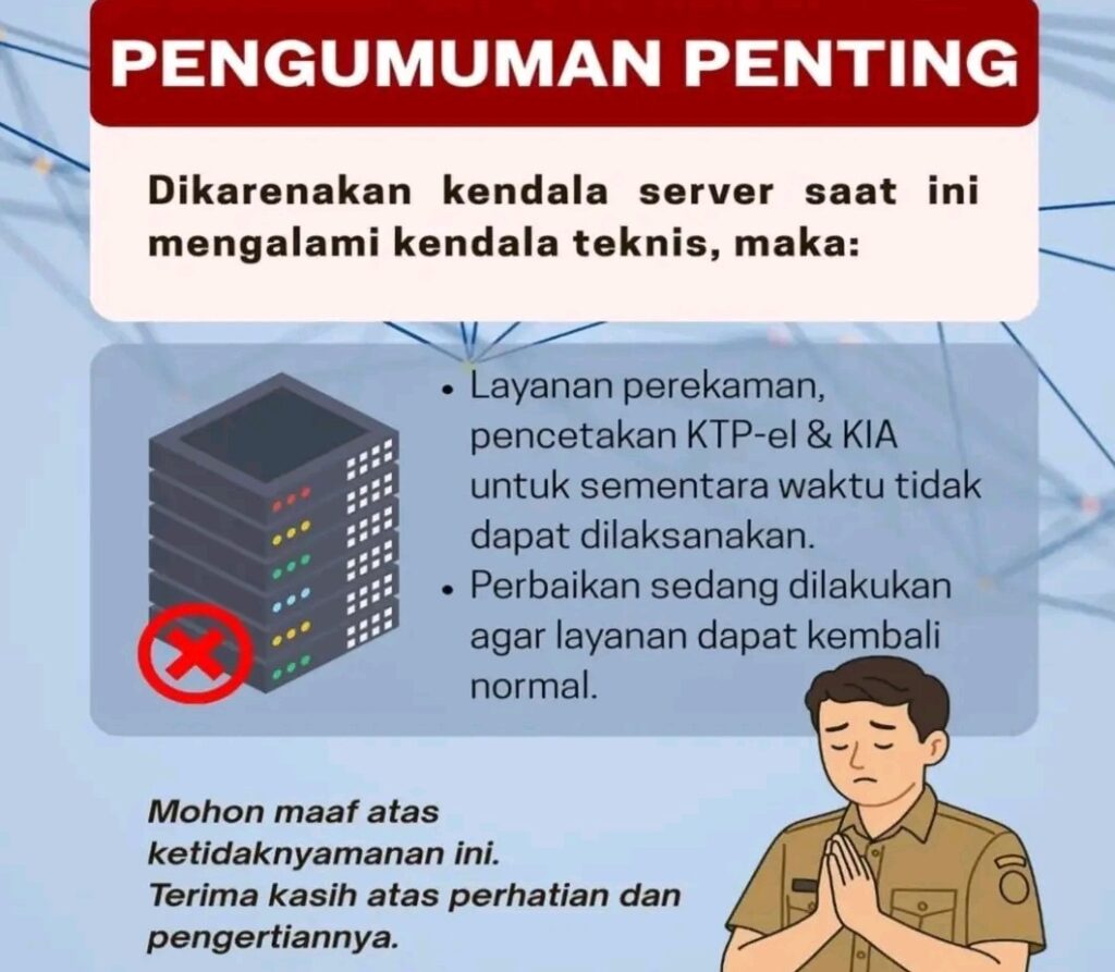 PEKANBARU(kompassindonesia.my.id) – Dinas Kependudukan dan Pencatatan Sipil (Disdukcapil) Kota Pekanbaru mengumumkan penghentian sementara layanan perekaman dan pencetakan Kartu Tanda Penduduk Elektronik (KTP-el) serta Kartu Identitas Anak (KIA). Langkah ini diambil akibat adanya gangguan teknis pada sistem server yang digunakan dalam pelayanan administrasi kependudukan tersebut.